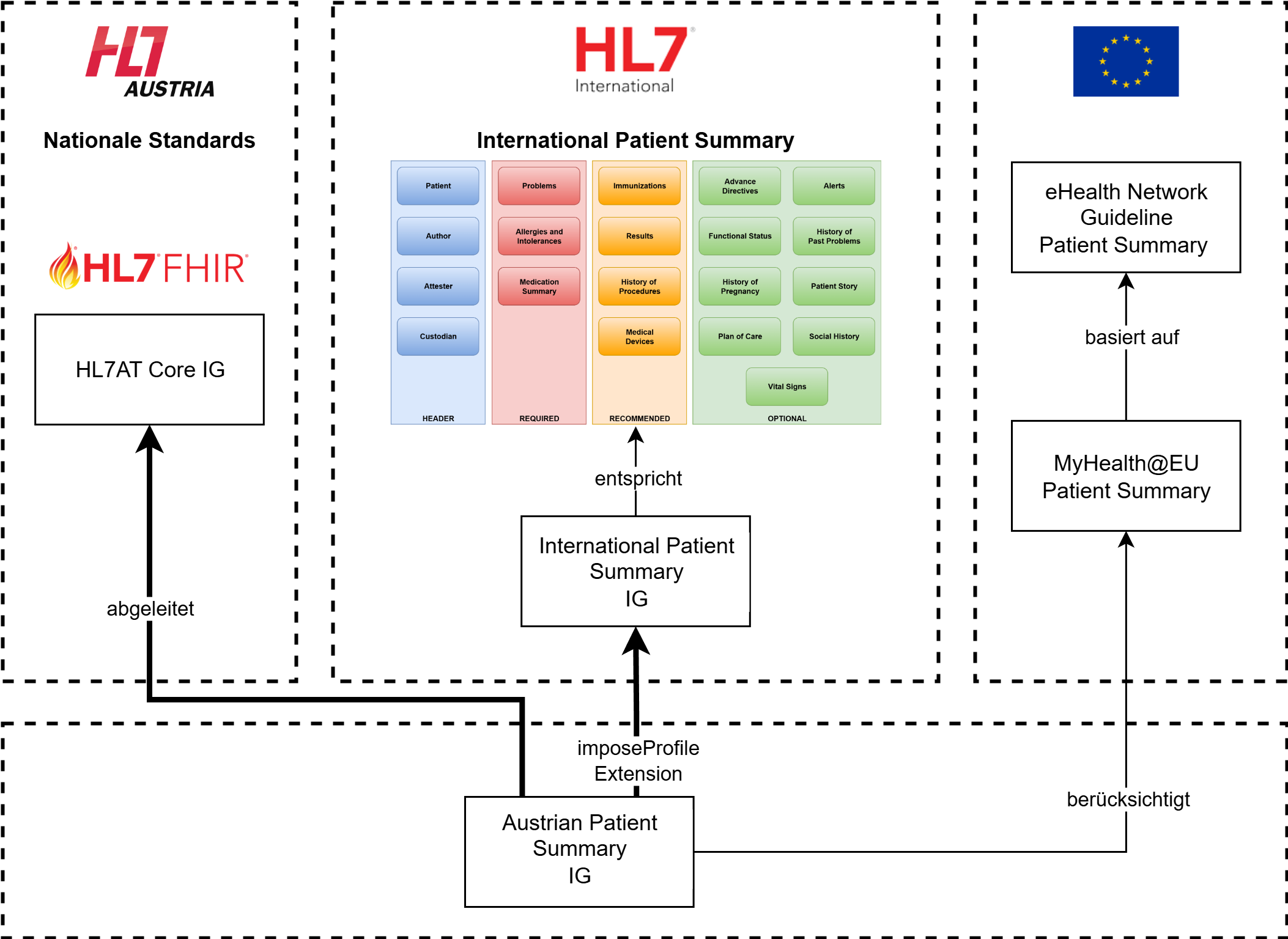 Die APS baut auf dem HL7® Austria FHIR® Core Implementation Guide (HL7AT Core IG), Version 2.0.0 und dem HL7® Leitfaden für die International Patient Summary (IPS), Version 2.0.0 auf.